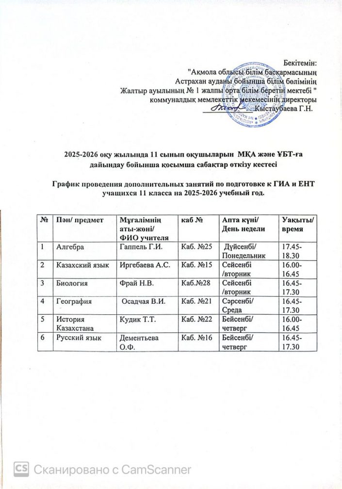 2025-2026 оқу жылына арналған 11-сынып оқушыларын МҚА және ҰБҚ- ға дайындау бойынша қосымша сабақтар өткізу кестесі