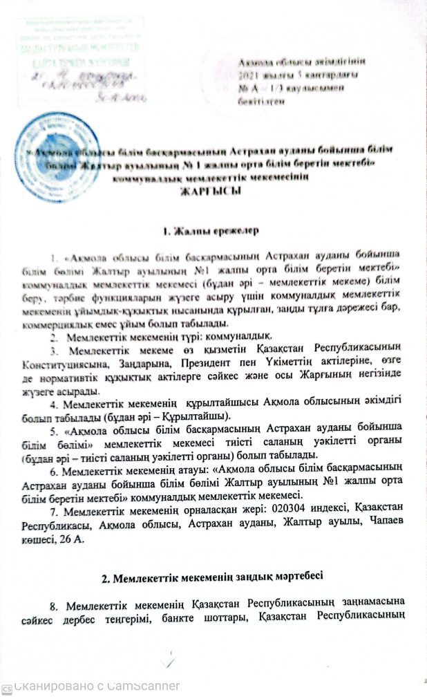 «Ақмола облысы Білім басқармасының Астрахан ауданы бойынша білім бөлімі Жалтыр аулының №1 жалпы білім беретін мектебі»  коммуналдық мемлекеттіқ мекемесі