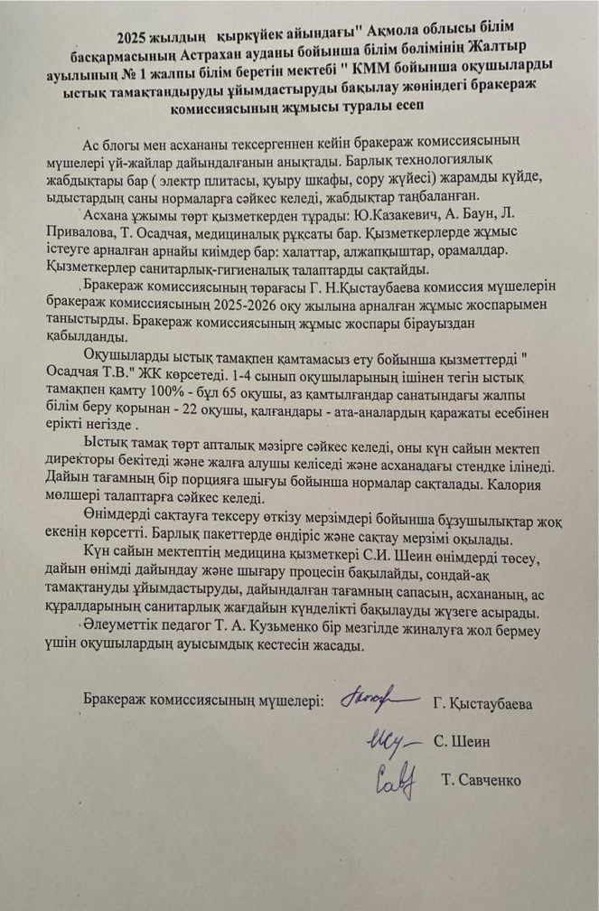 Бракераж комиссиясының 2025 жылғы қыркүйек айындағы есебі