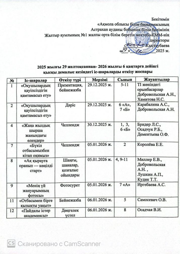 Қысқы демалыста іс-шаралар өткізу жоспары