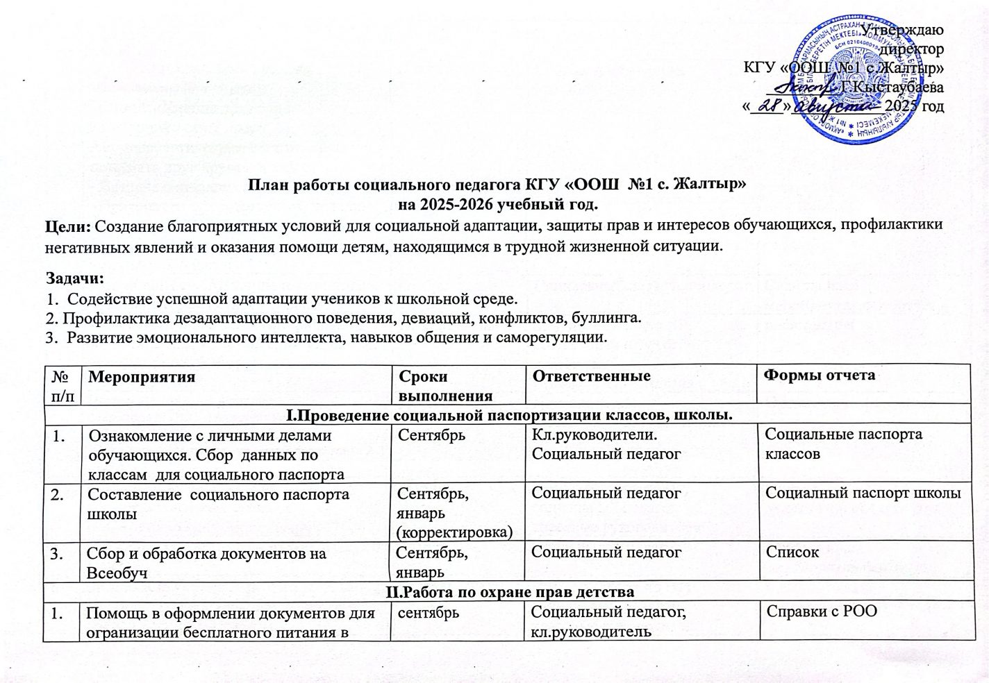 Әлеуметтік педагогтың 2025-2026 оқу жылына арналған жұмыс жоспары