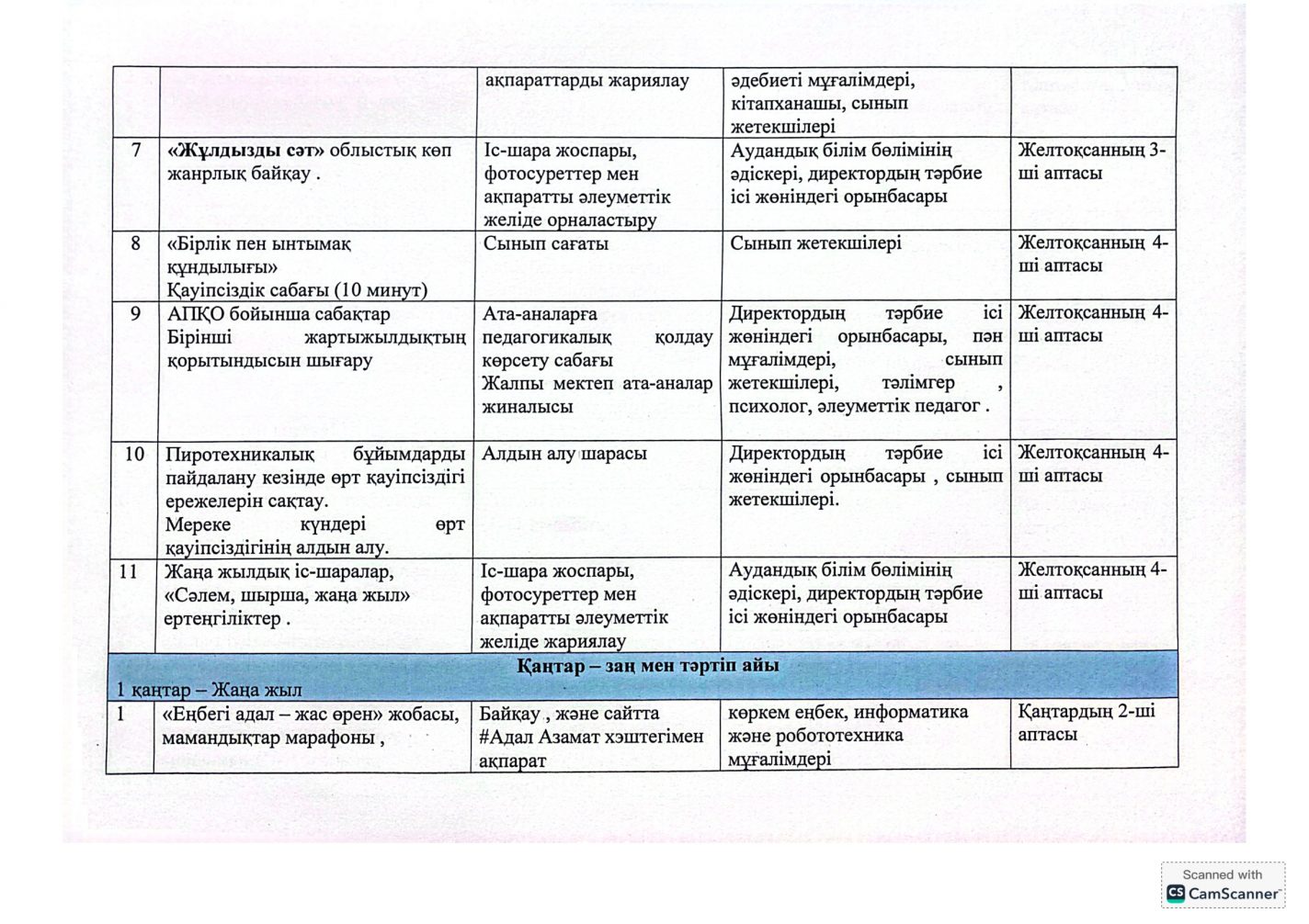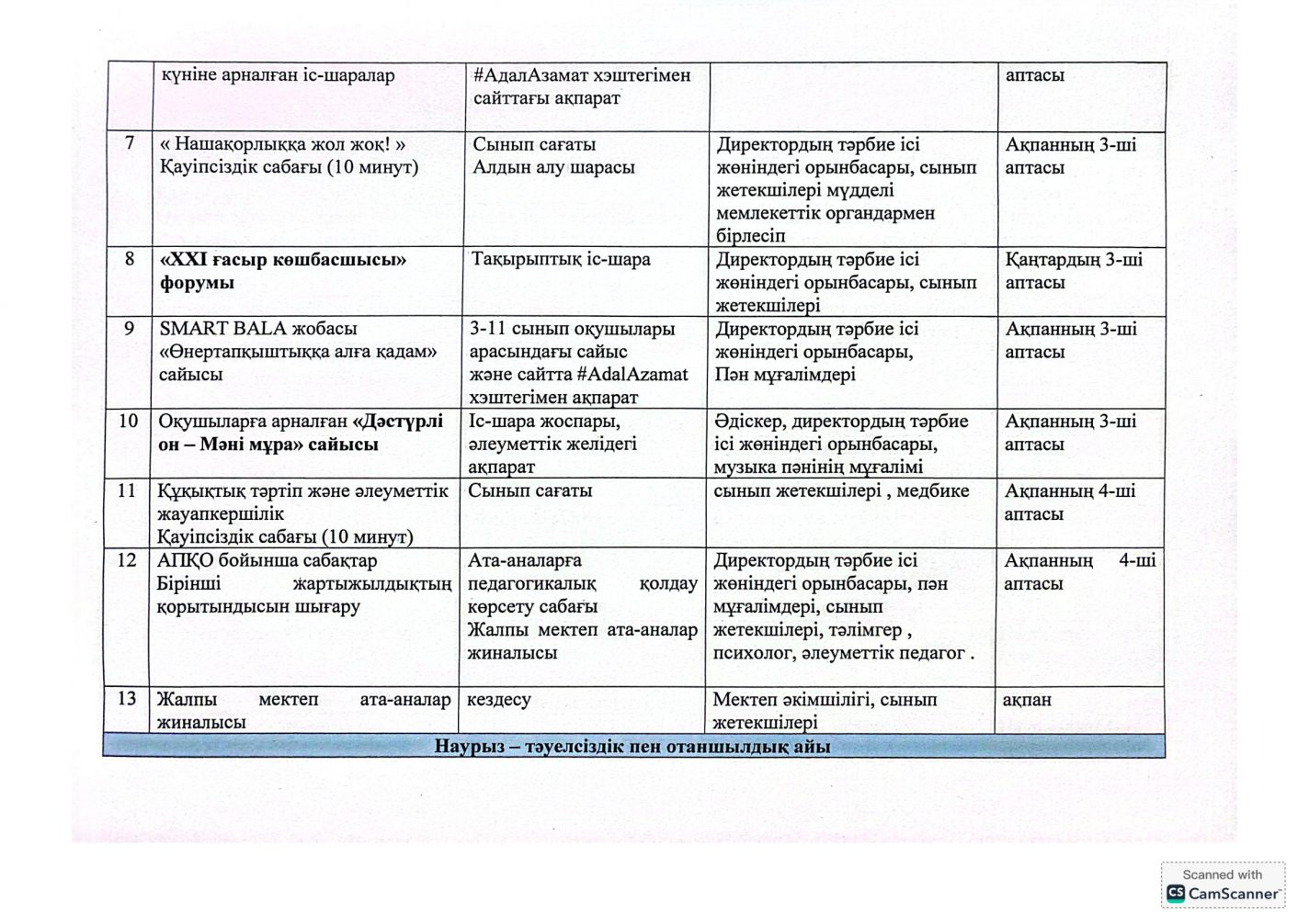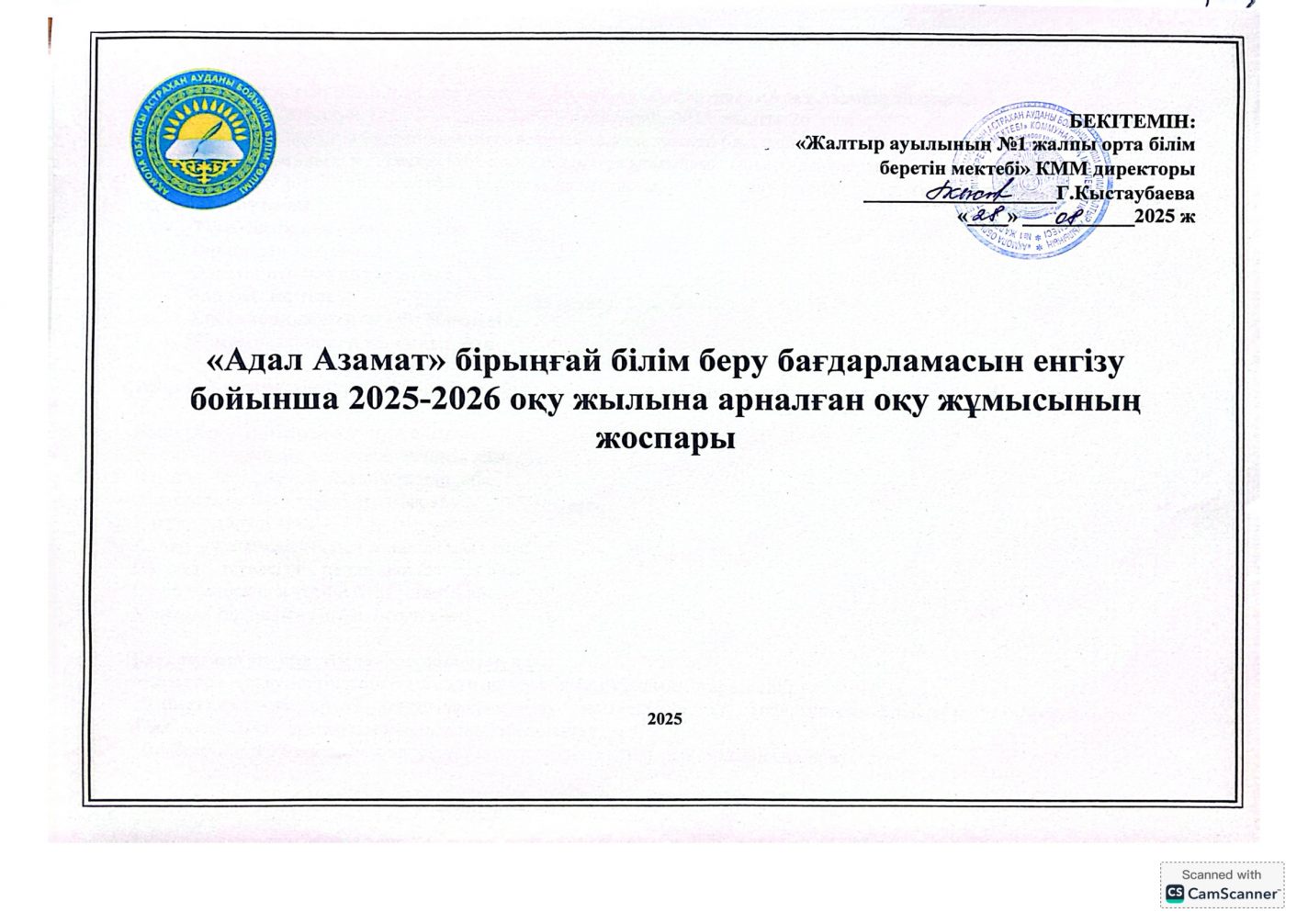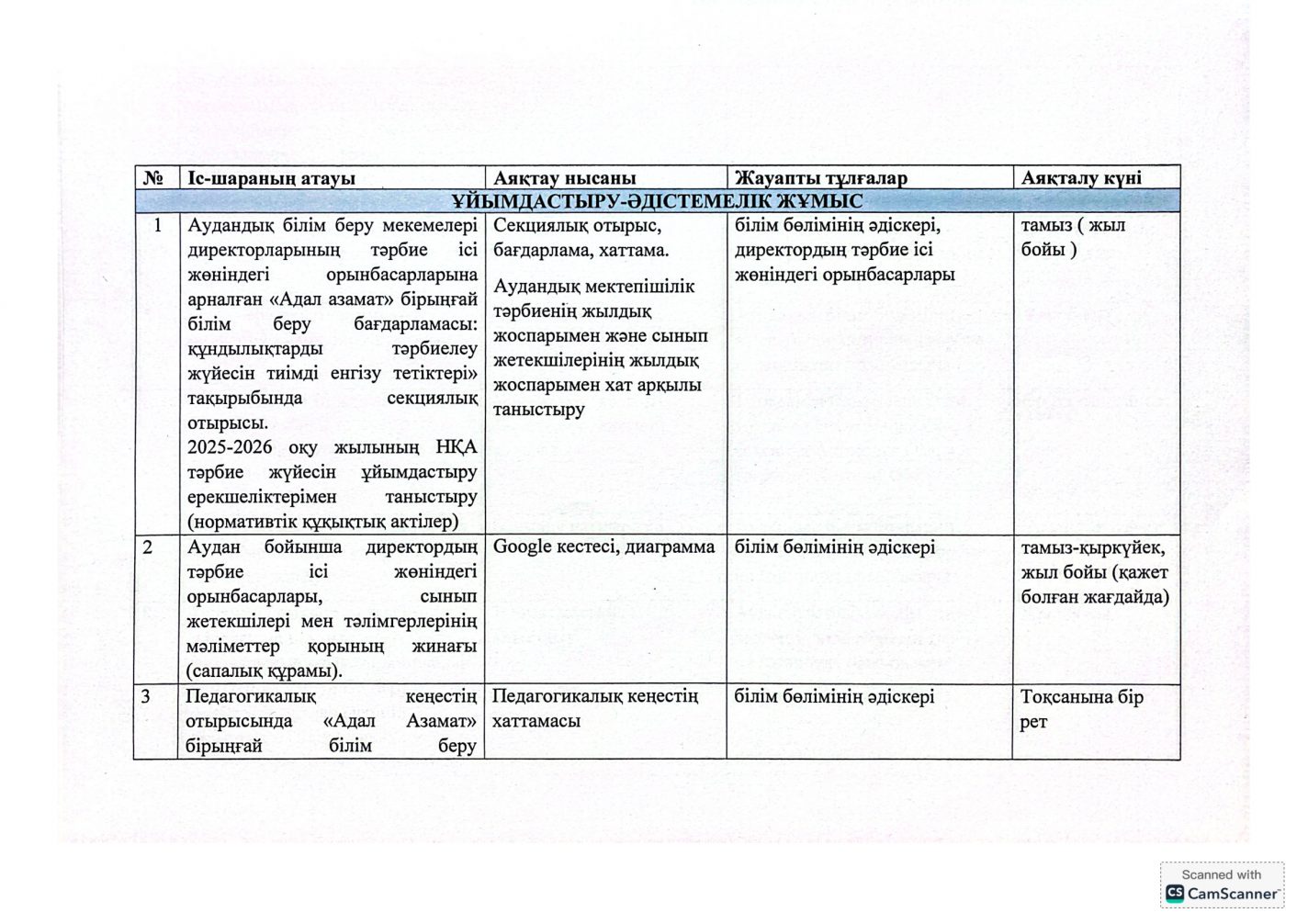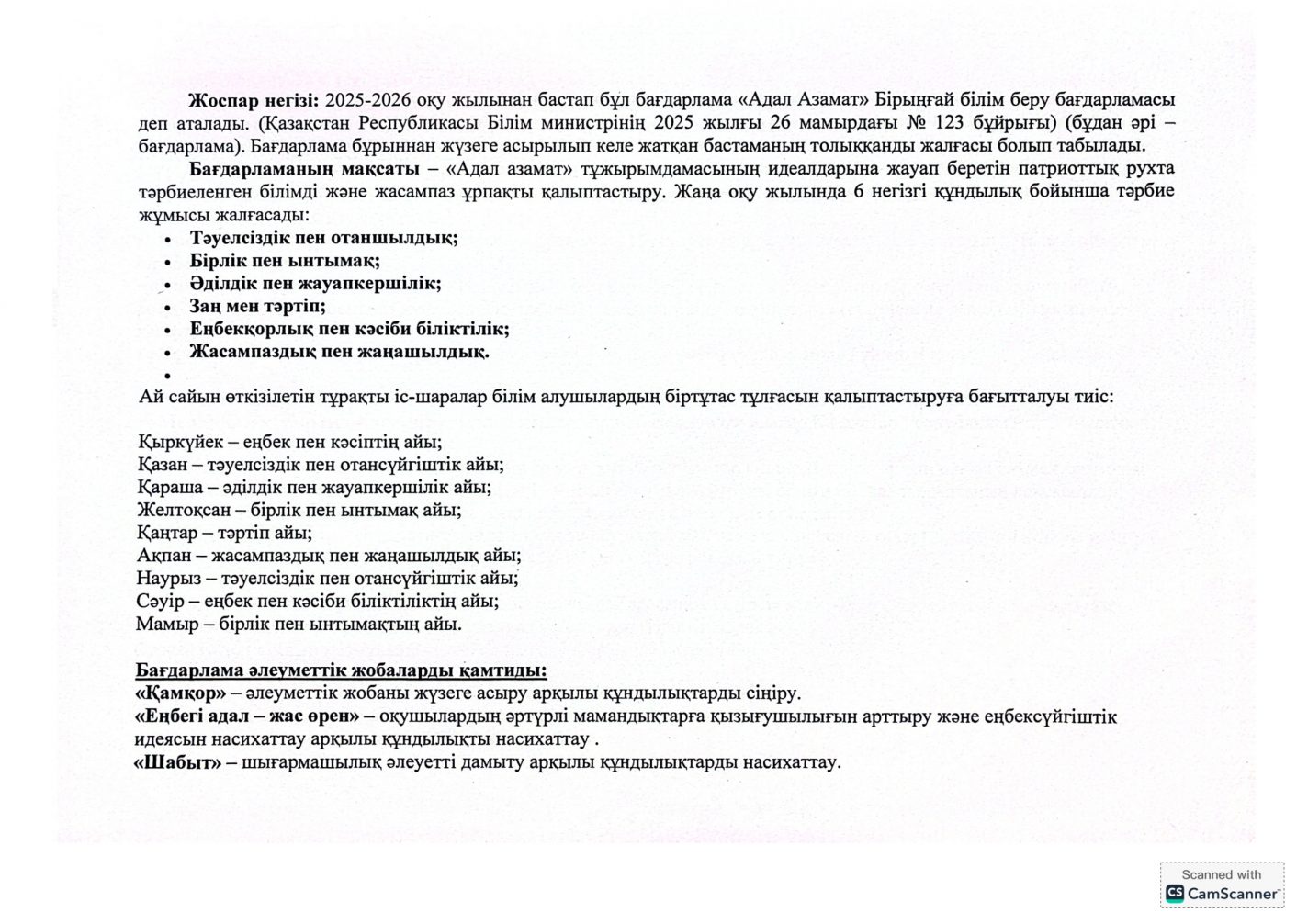 "Адал азамат" бірыңғай тәрбие бағдарламасын іске асыру бойынша 2025-2026 оқу жылына арналған тәрбие жұмысының жоспары