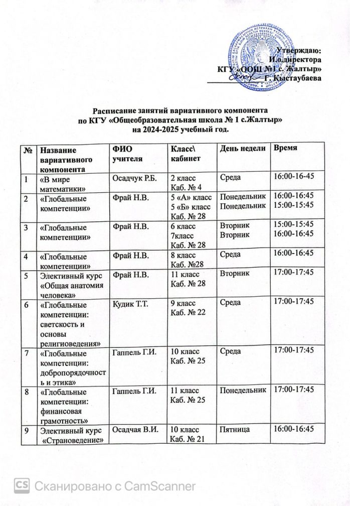 Разработанное и утвержденное расписание занятий вариативного компонента за оцениваемый период